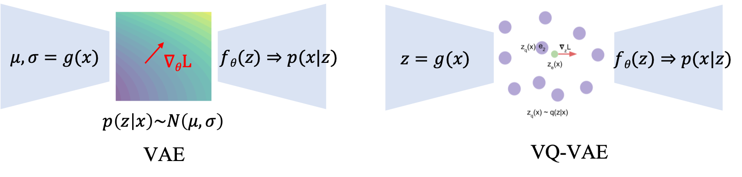 In VAE, $z$ is the latent variable. We havs $p(z|x)$ decided by $g_\Phi(x)$, where $g_\Phi(\cdot)$ is the encoder of VAE, and a prior distribution $q_\theta(z)\sim N(\mu,\sigma)$. The generation (decoding) process can be formulated as $x’=f_\theta(z)\sim p(x|z)$. We assume $q_\theta(z|x)=N(z;\mu_\Phi(x),\sigma_\Phi(x)^2I)$, $p(z)\sim N(z;0,I)$, and $x\sim N(x;f(z),\epsilon I)$. The object function now is $$L_\theta(x)=-\frac12 E_\theta(z)[|| x-f_\theta(z)||_2^2]-\frac12 (N\sigma _\Phi(x)^2+||\mu _\Phi(x)||^2_2-2Nlog\sigma _\Phi(x))+Const$$.