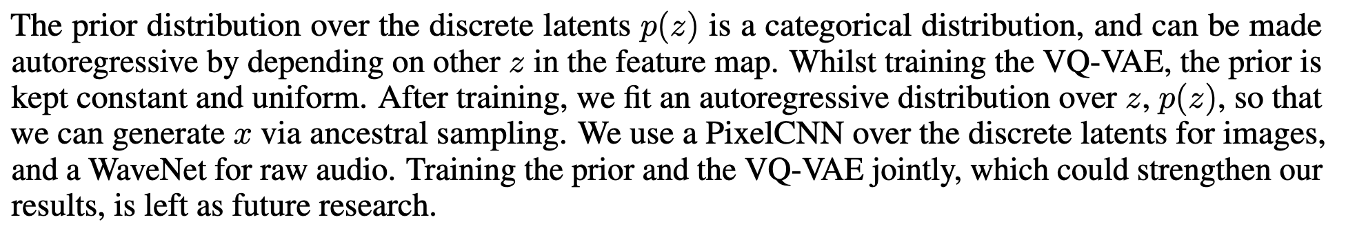 The generation process of VQ-VAE requires a PixelCNN to auto-regressively predict the next index. During training, prior $p(z)$ is a uniform distribution. But during generation, the index is random sampled first then predicted, without the help of the encoder.
