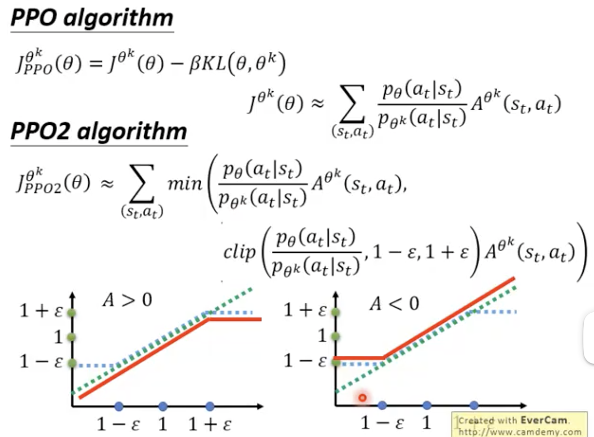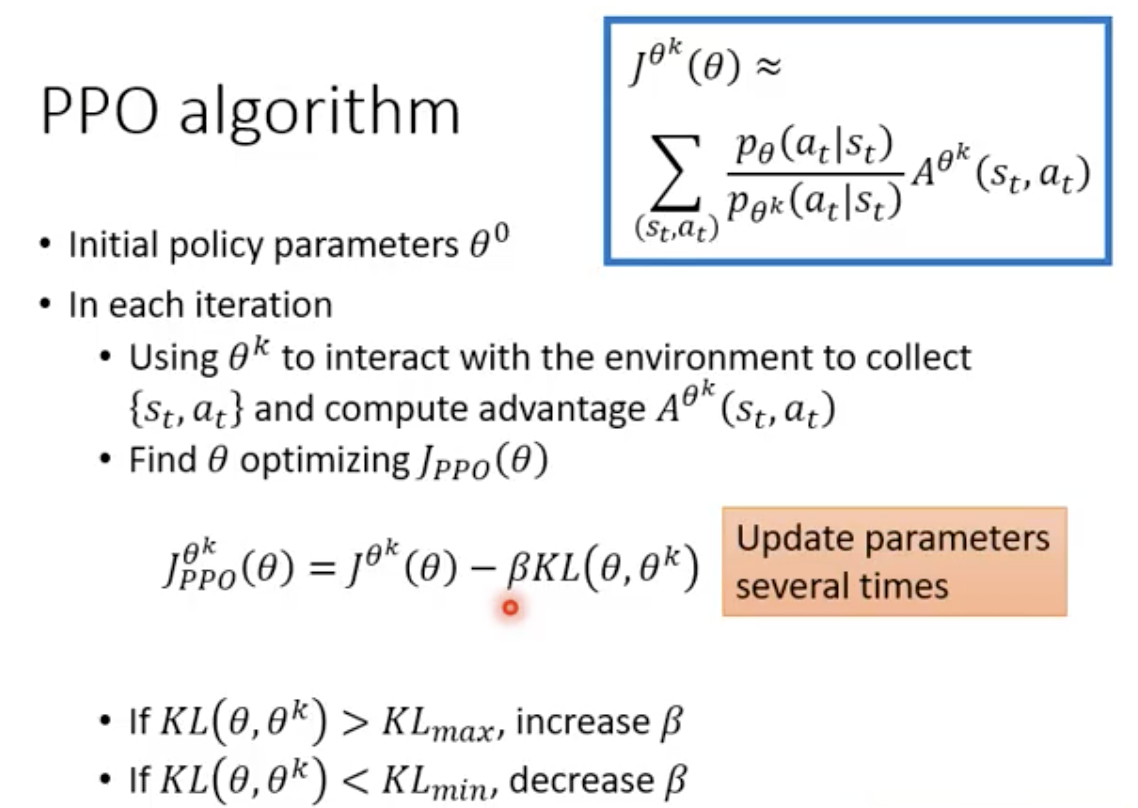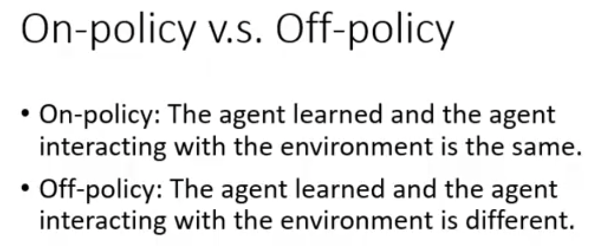 On-policy learning is very time-consuming since the agent $\pi_{\theta}$ has to interact with the environment to sample the data before each update. Off-policy aims to use another actor $\pi_{\theta’}$ to sample data and provide information for the learning process of $\pi_{\theta}$.