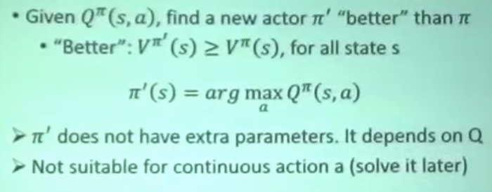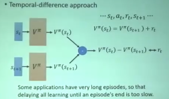 It outputs the expected cumulated reward for actor $\pi$ after taking an action and reaching state $s$. It takes the state $s$ after action as the input. Different actor can have different output after a same observation and action. We can use Monte-Carlo based approach to formulate it as a regression problem. We can also use Temporal-difference approach.