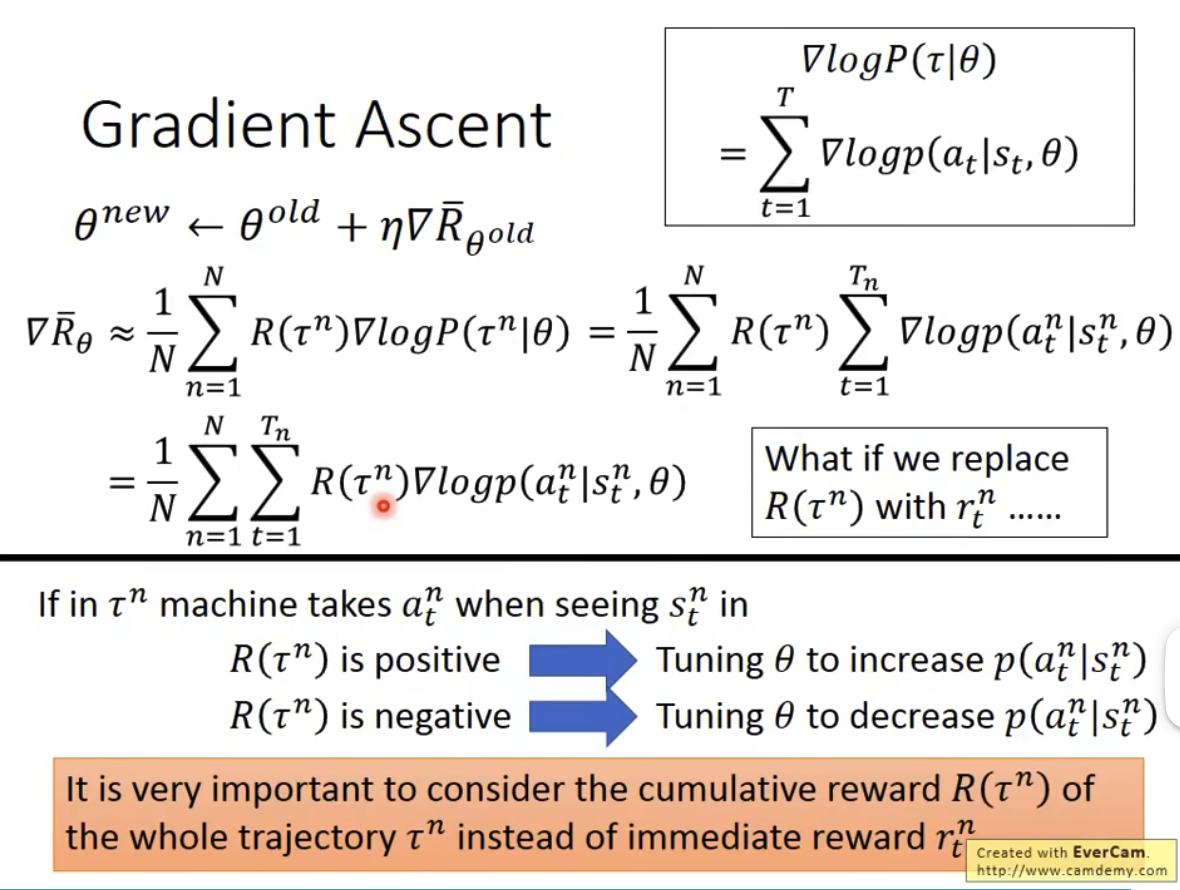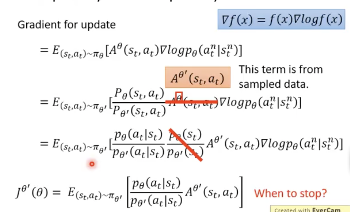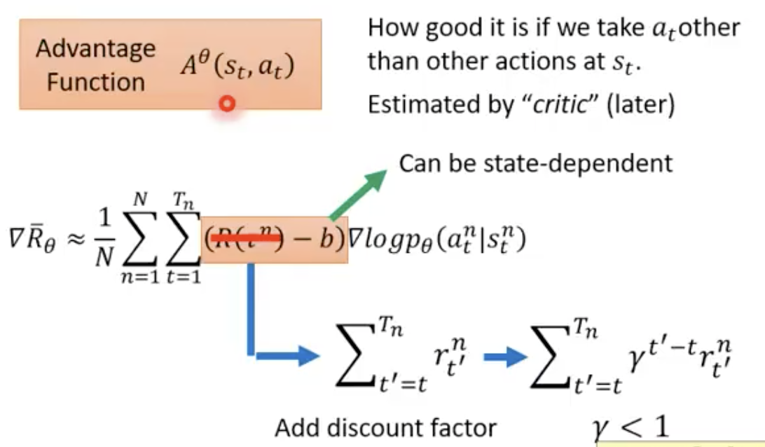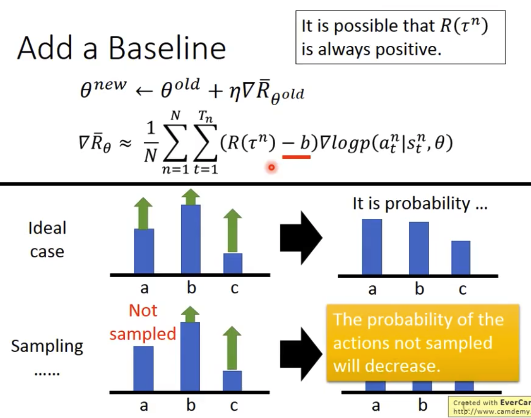 If all the actions have positive rewards, the model will favor the actions which have been sampled more frequently, leading to the decline of probablity of less-frequent samples. Adding a baseline can ensure not every action is positive. The baseline can be a model or a statistic value. We define advantage function as: $$A^\theta(s_t,a_t)=R(\tau^t)-b$$