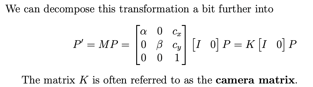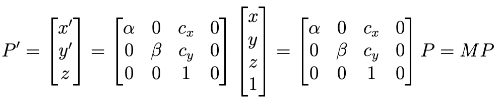 At the same time, the points in digital images are expressed in pixels, while points in image plane are represented in physical measurements (e.g. centimeters). Two new parameters $k$ and $l$, whose unit is something like pixel/cm, are introduced for unit translation. If $k = l$, the camera has square pixels. Now, the mapping is:$$P’=[x’,\ y’]^T=[\frac{xfk}{z}+c_x,\ \frac{yfl}{z}+c_y]^T=[\alpha\frac{x}{z}+c_x,\ \beta\frac{y}{z}+c_y]^T$$