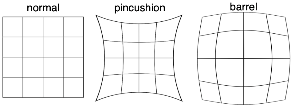 Radial distortion, which causes the image magnification to decrease (barrel distortion) or increase (pincushion distortion) as a function of the distance to the optical axis.