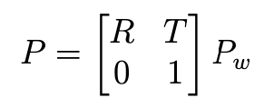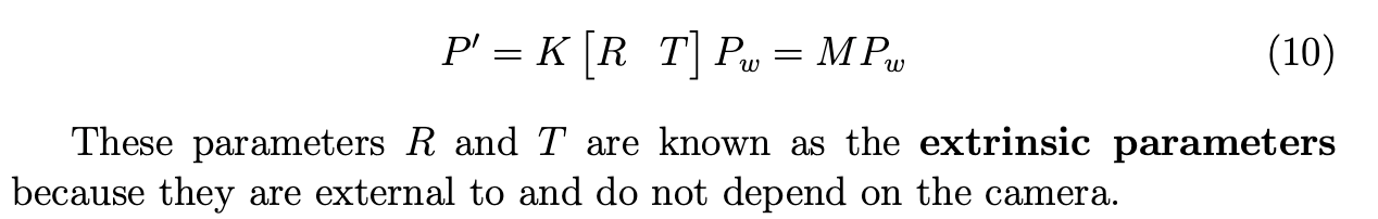 It relates points from the world reference system to the camera reference system. This transformation is captured by a rotation matrix $R$ and translation vector $T$. Given a point in a world reference system $P_w$: