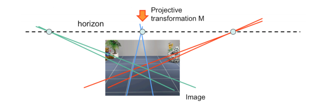 If we apply a projective transformation to one of these points at infinity $x_∞$, then we obtain a point $p_∞$ in the image plane, which is no longer at infinity in homogeneous coordinates, which is known as a vanishing point.