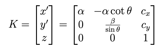 Overall, camera matrix K has 5 degrees of freedom: 2 for focal length, 2 for offset, and 1 for skewness. These parameters are collectively known as the intrinsic parameters.