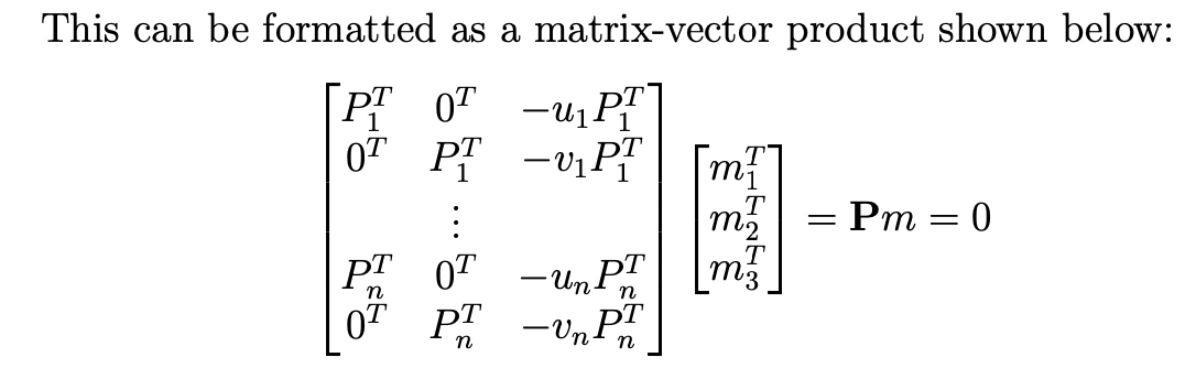 Now we expand $P’=(x’,y’)$ to $P’=(x’,y’,1)$ to allow above transformation to be written in matrix multiplication form. The final coordinate has to be 1, so $(v_1,v_2,…,v_n,w)$ has to be written in $(\frac{v_1}w,\frac{v_2}w,…,\frac{v_n}w)$. Now, we have: